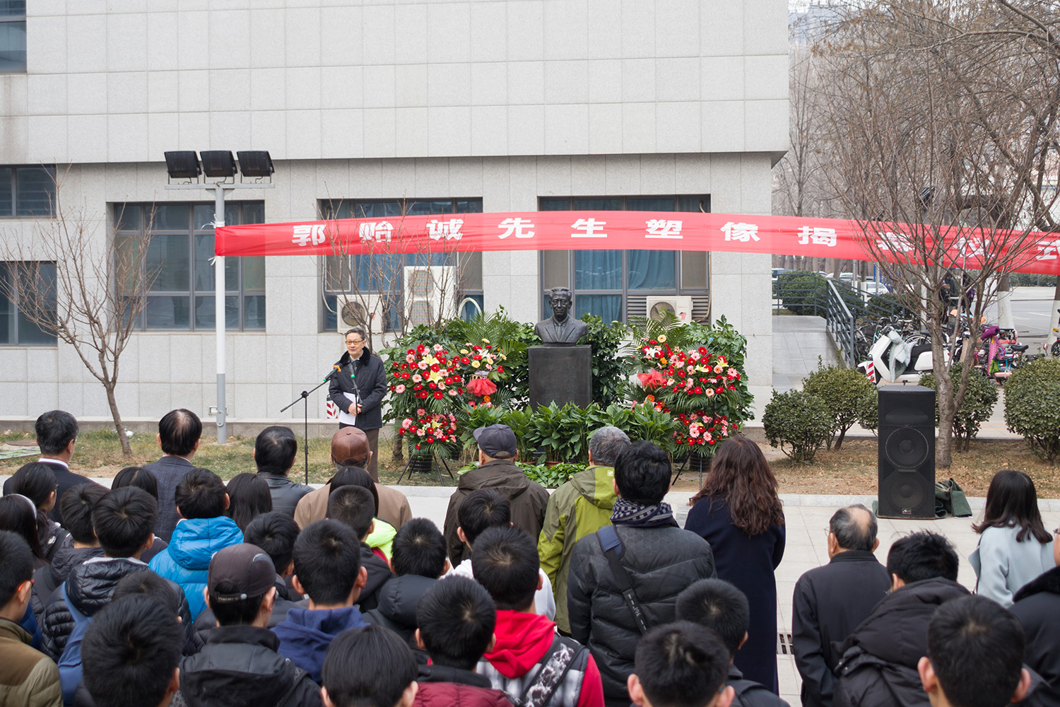 12月22日下午,我国磁学和磁性材料教学和研究工作的奠基人之一郭贻诚先生塑像揭幕仪式在山东大学中心校区知新楼C座楼前广场隆重举行。中国工程院院士、钢铁研究总院李卫教授,山东大学常务副校长王琪珑教授,山东大学校友会副会长、山东大学天津校友会会长、物理学院78级校友、天津开发区新天地投资开发有限公司董事长许继、山东大学校友工作办公室主任王宗义、物理学院院长陈峰教授参加此次仪式。参加仪式的还有郭贻诚先生学生代表、学院部分师生代表等。仪式由物理学院党委书记李建平主持。