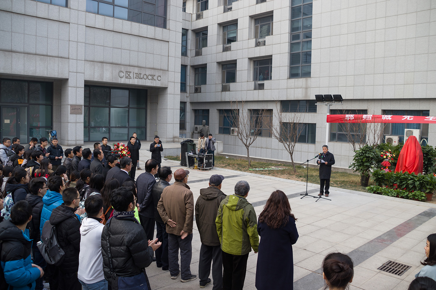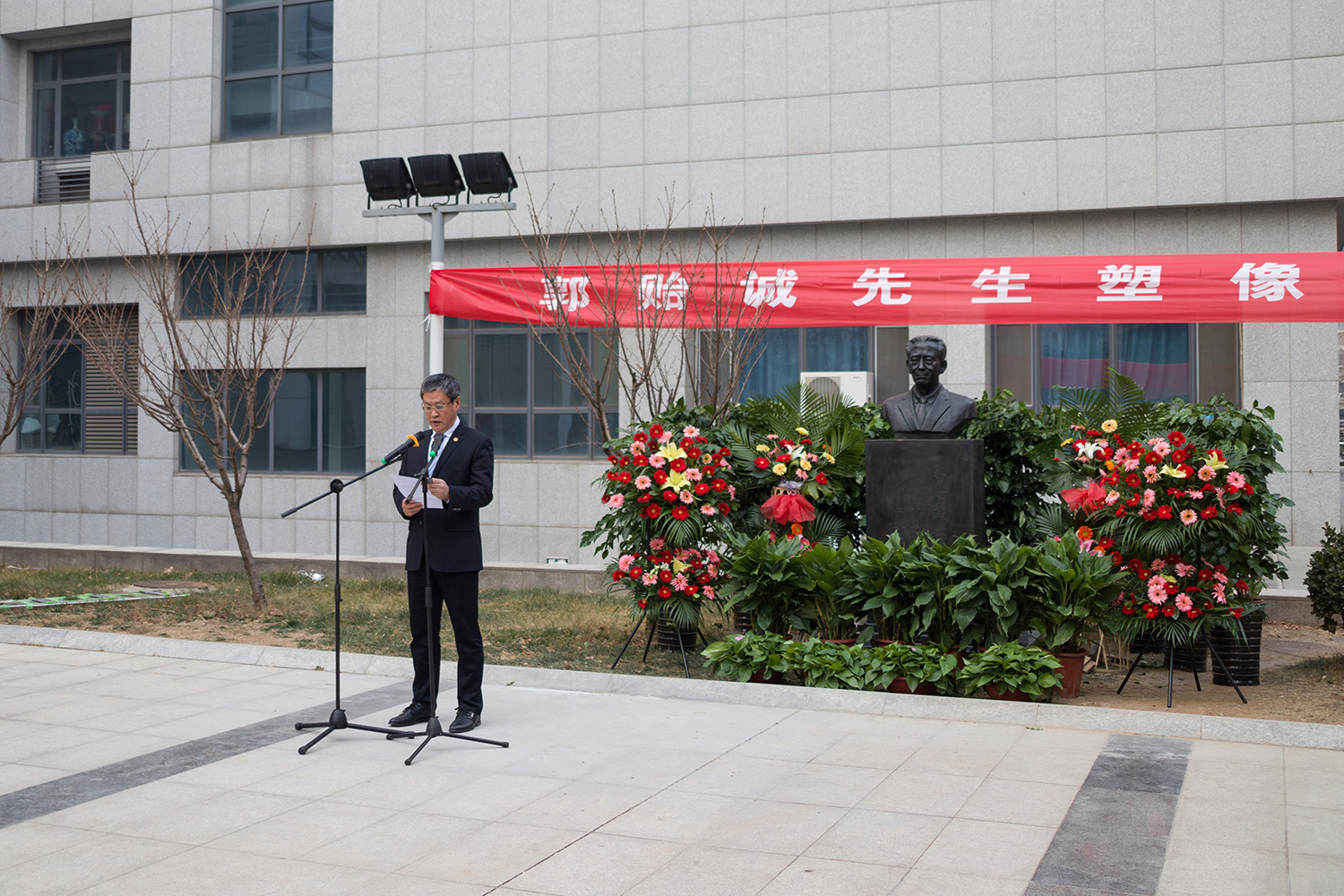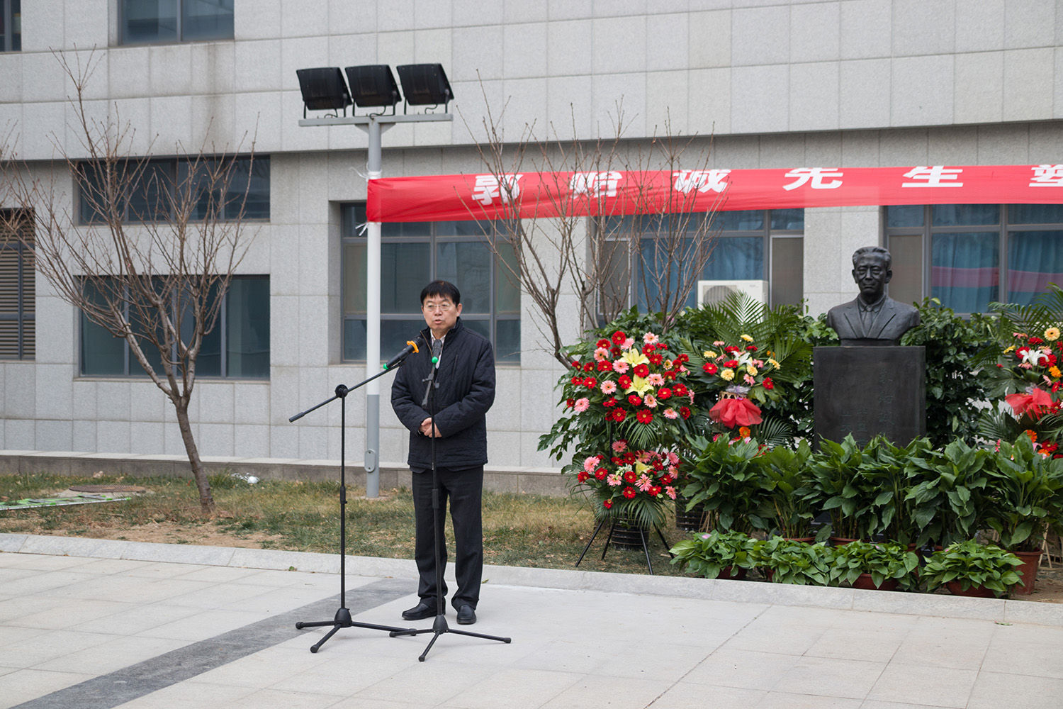 仪式现场,李卫、王琪珑、许继和陈峰共同为郭贻诚先生塑像揭幕。随后,物理学院学生代表向郭贻诚先生塑像敬献花篮,全体与会成员向塑像行礼,表达对郭贻诚先生的缅怀之情。
