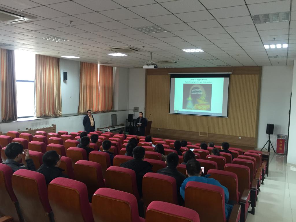 18日下午,Carney教授面向我院师生和泰山学堂物理取向学生做了题为Lens vs Algorithm: imaging in the computer age的学术报告,介绍了他的主要研究工作。他还向前来听报告的学院师生介绍了罗切斯特大学以及光学研究所的基本情况。