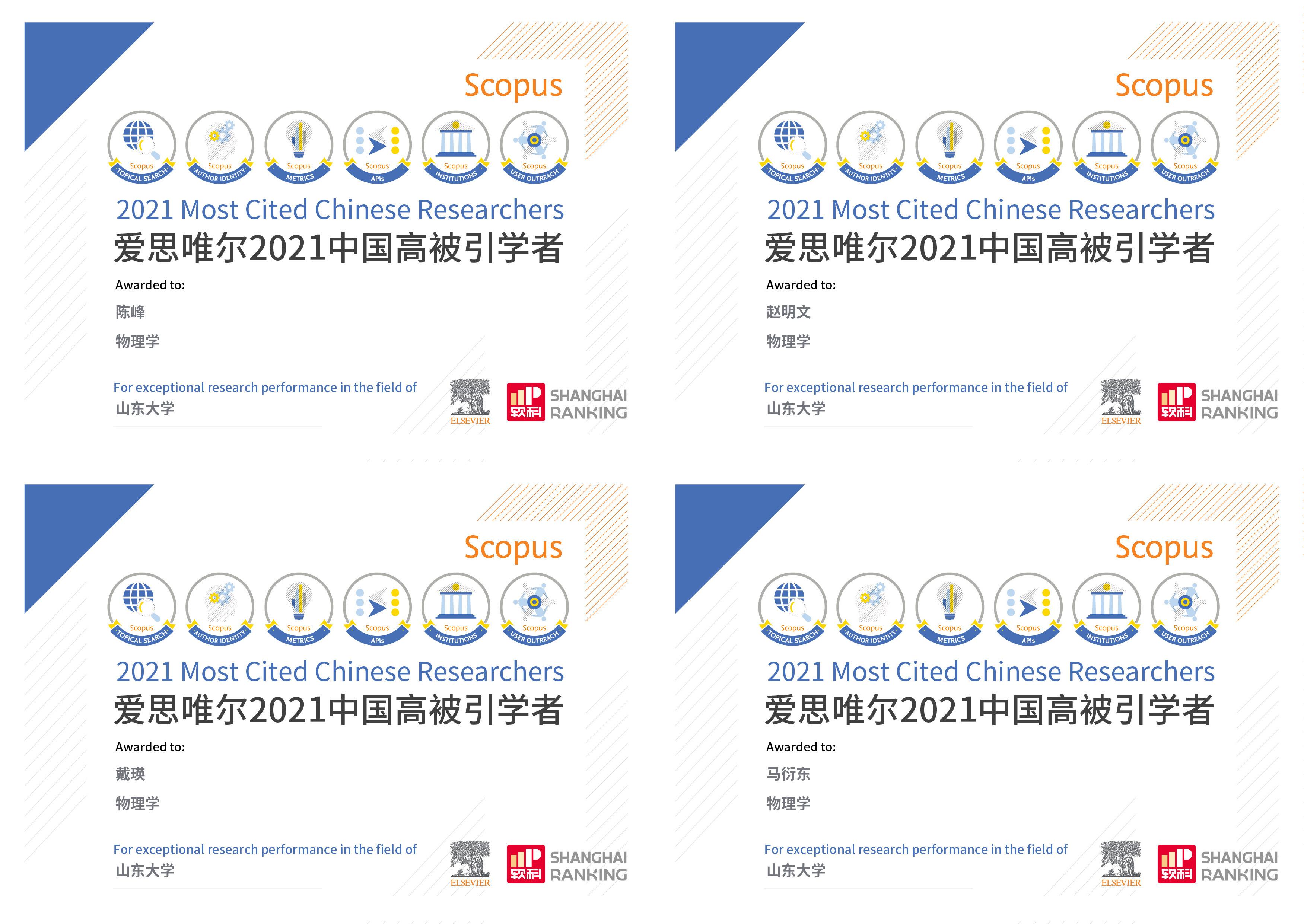 近日,学术出版业巨头爱思唯尔(Elsevier)正式发布了2021年“中国高被引学者”(Highly Cited Chinese Researchers)榜单,物理学院陈峰、赵明文、戴瑛、马衍东四位教授入选“物理学”学科榜单。其中陈峰教授和赵明文教授连续8年上榜(2014-2021),戴瑛教授和马衍东教授是第2次获此殊荣。
