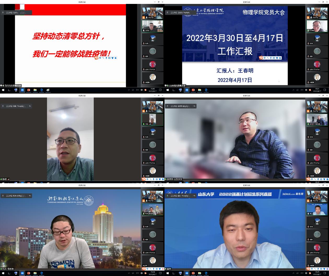 会上,原子与分子研究所所长、党支部副书记马衍东教授,分享了自己驻校期间的学习、教学、科研和生活情况,表达了干事创业热情不减的激情、科研保质保量推进的担当以及抗疫必将胜利的信心;凝聚态党支部副书记王春明教授,分享了理论学习情况,谈及关于基础学科人才培养的有关精神和要求,为广大教职工投身学院学科建设鼓足了干劲,特别宣扬了获山东省自然科学一等奖并由山东电视台报道的仝殿民教授在量子信息领域取得的成绩,以身边人的事迹激励大家强院兴校的自觉,并从牛顿力学发展史引申到疫情防控,为大家坚定了抗疫的信心;光电所党支部书记陈明研究员,着重从做好实验室运转、管理向大家介绍了情况,封校期间搭建起校内外导师的桥梁,为学生正常开展实验保驾护航;粒子党支部李洋洋教授,重点围绕在线教学的互动性问题进行了交流,分享了与研究生沟通交流的问题;机关党支部、院办主任侯志涛,分享了学院在封校期间如何做好服务管理保障工作;校外工作组组长副院长秦伟教授,围绕做好校内师生的保障工作进行了交流;学院党委副书记辛莹,围绕学工队伍工作从教育、管理、服务三个方面进行了交流。