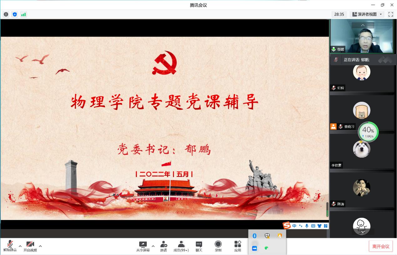 5月7日上午,为深入学习贯彻习近平总书记在中国人民大学考察时的重要讲话精神和中共中央政治局常务委员会关于新冠疫情防控最新指示精神,落实立德树人根本任务,推进思政课改革创新,教育和引领师生自律自强,传承山大人优秀品质,凝聚战胜疫情的奋进力量,物理学院组织召开专题党课辅导。学院党委书记郁鹏主持并进行党课辅导。