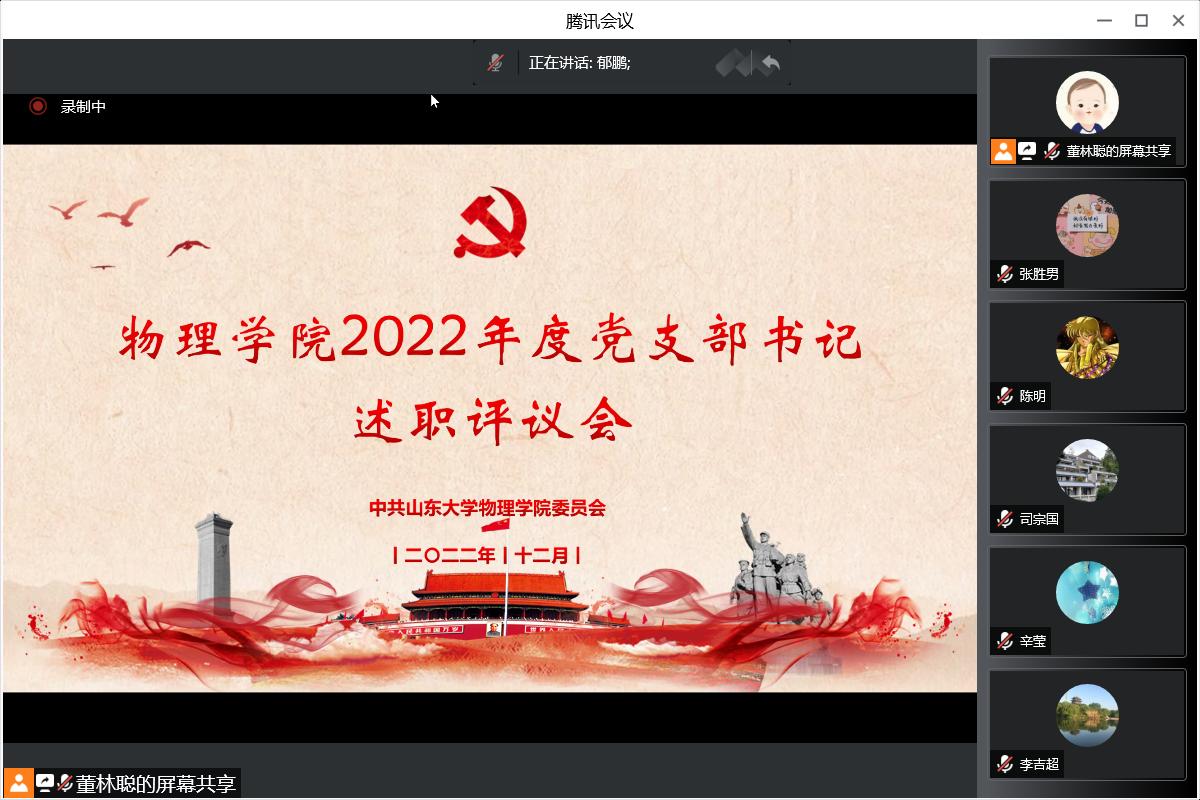 12月29日,根据学校关于做好2022年度党组织书记述职评议考核的有关通知要求,物理学院党委线上召开2022年度党支部书记述职评议会。学校党委副书记陈宏伟出席会议并作重要讲话。学校党建实地考核第一工作组组长、校工会主席刘相金列席会议并作点评。考核组副组长毛永强,组员孙玮茄、苏伟列席会议。院长司宗国、全体党委委员及师生党支部书记参加会议,会议由院党委书记郁鹏主持。