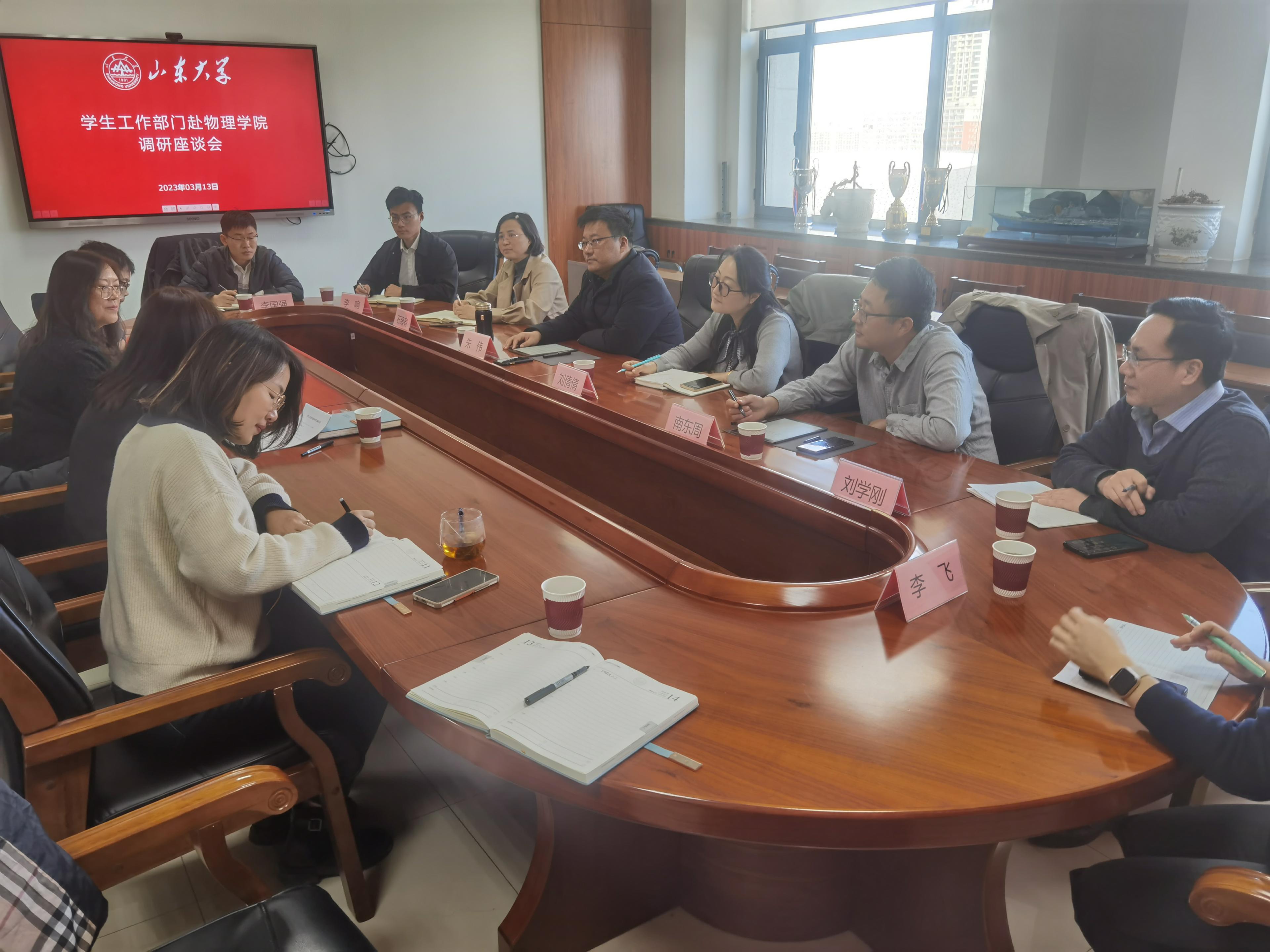 3月13日,山东大学学生工作部门一行赴物理学院就学院学生工作情况进行调研座谈。党委学生工作部副部长朱伟,党委学生工作部教育科、管理科、资助科、心理中心、公寓管理中心和党委研究生工作部、校团委等部门有关同志,物理学院正处级辅导员张倩、党委副书记辛莹及学院部分辅导员参与调研。
