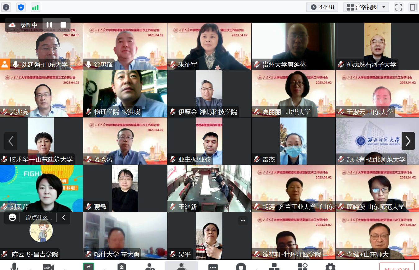 4月2日下午,山东大学大学物理课程虚拟教研室第三次工作研讨会顺利举办。会议采用线上形式,喀什大学、贵州大学、石河子大学、西北师范大学、河南科技大学、北华大学、牡丹江医学院、昌吉学院、山东师范大学、山东建筑大学、高等教育出版社等40多所成员单位及高校的80余位老师参加了会议。本次会议以青年教师成长为主题,围绕教学成果的培育、教师讲课比赛、教学技能提升等方面进行研讨。山东大学本科生院副院长姜兆亮教授参加会议并致辞,开幕式由虚拟教研室主任刘建强教授主持。