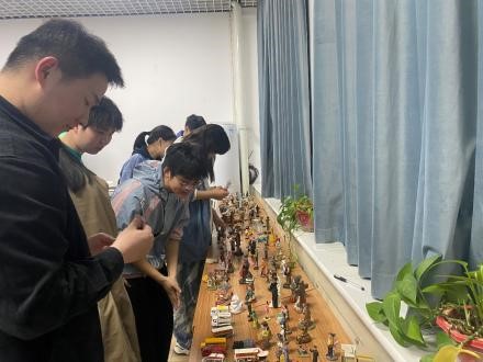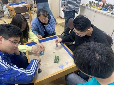 其后,他将同学们分为了四个小组,每组五人,然后简单地讲解了一下游戏规则。大家先挑选一轮,每人挑选一个最能代表自己的沙具后回到座位,小组成员讨论摆放顺序后即可自由摆放,但在其他成员摆放时必须保持安静。在第一轮摆放后,每人可再取三组自己喜欢的沙具,按照之前协定下来的顺序再次依次摆放三轮,同样整个过程保持安静。在摆放完毕后,大家各自就自己的沙具和摆放位置进行交流,同时也可以提出自己的疑问。讨论完毕后,可以试着从不同的视角去观看小组的成果,同时感受在整个过程中个体与团体的碰撞。在组内交流后,孙老师邀请每个小组选出一位代表来分享与讲解本小组的作品,大家在欣赏其他小组的作品之后对团体心理和个人心理的冲突和交融也有了更加深刻的理解。