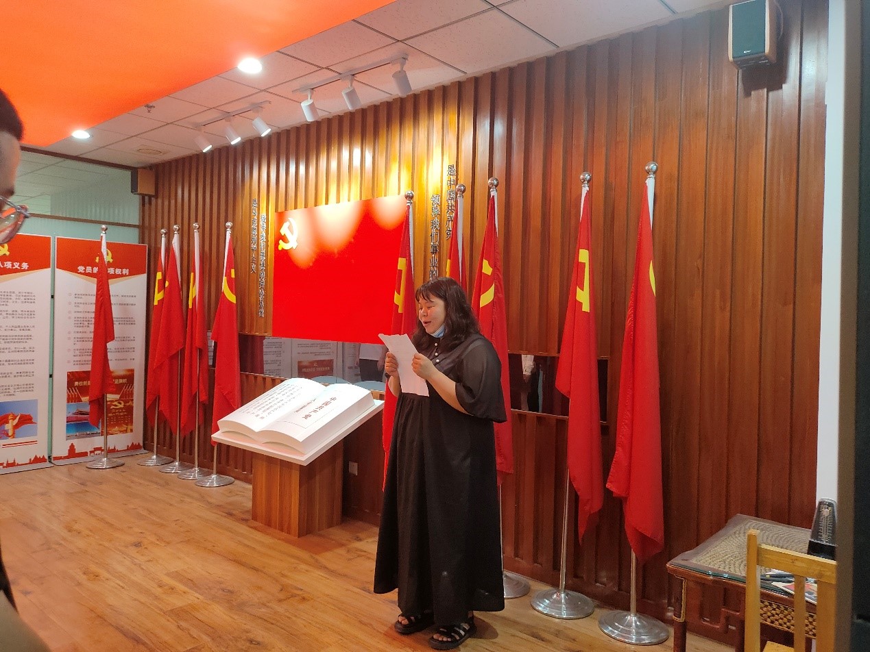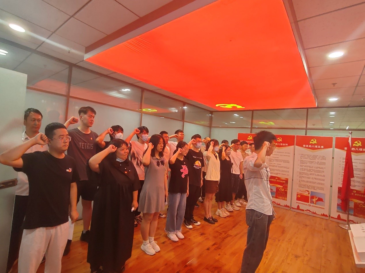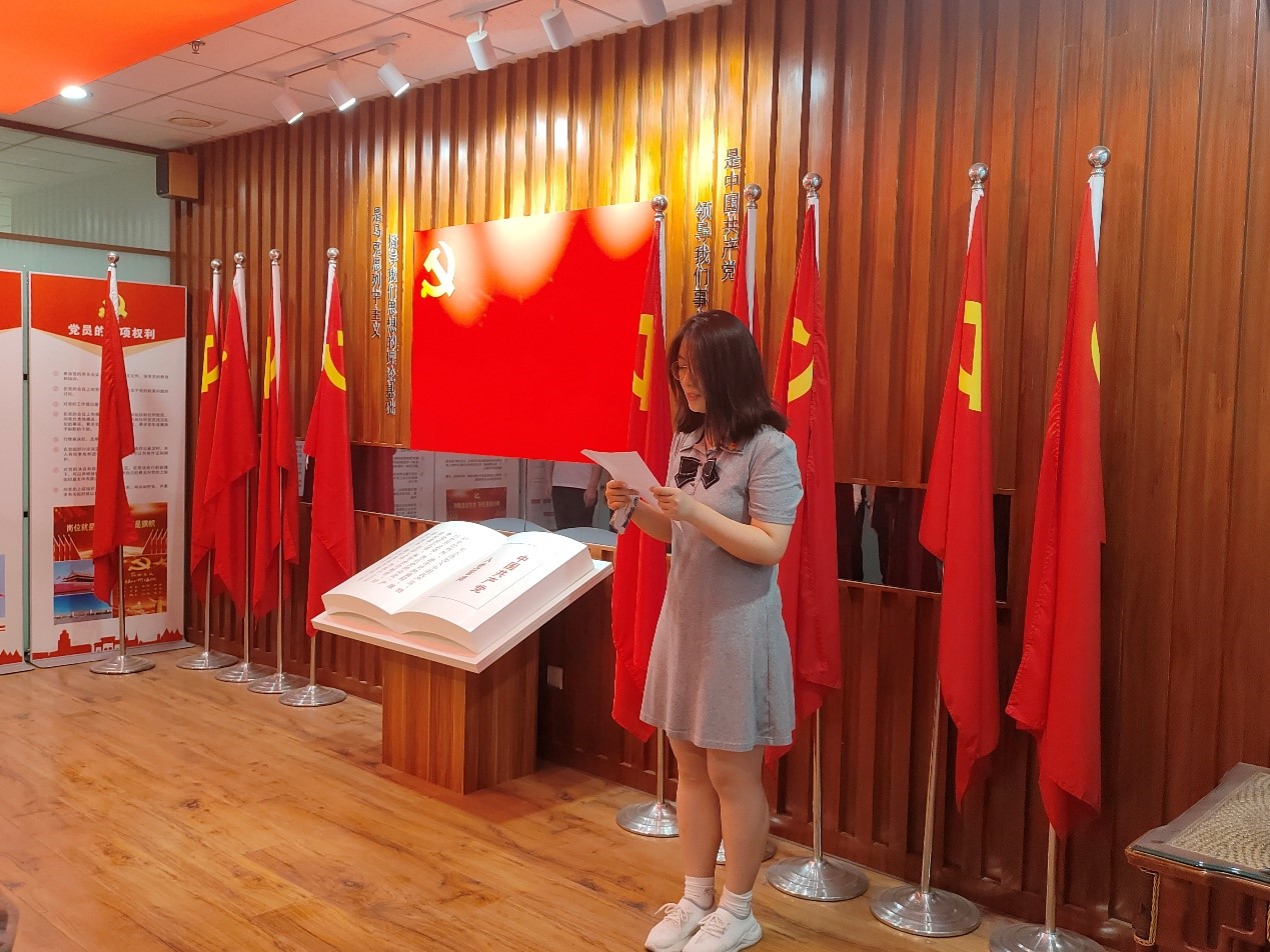 宣誓仪式上,全体党员起立并奏唱国际歌。博士研究生毕业班党支部书记谈畅同志带领全体新党员面对党旗宣誓,誓词阵阵,掷地有声,字句间满含党员的满腔热忱和赤诚之心。
