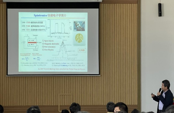 首先,韩秀峰老师简述自旋电子学的发展与应用历程,表示“自旋电子学处在发展的黄金三十年”,而“探索新材料、新物理与新器件是发展自旋电子技术的关键科学问题”。接着,韩老师对目前自旋电子学的热门方向进行总结,并对当下自己已经完成的工作和正在研究的方向进行介绍,如新型磁性隧道结及其隧穿磁电阻(TMR)、基于量子阱态的自旋共振隧穿磁电阻(QW-TMR)、磁子阀(MV)和磁子结(MJ)等新奇自旋量子效应研究,以及相关的磁异质结构材料和自旋量子效应及在自旋电子学核心器件方面的代表性应用。最后,韩老师分享了自己的科研经历,并鼓励大家积极参与科研工作。问答环节中,同学们积极提问,韩老师对“二维磁性材料的研究与应用前景”“自旋电子学的未来发展趋势”“如何学习和科研”等问题给出了自己独到的见解,令人深受启发。最后,在老师与同学们热烈的掌声中,此次报告会圆满结束。本次报告内容充实有趣,“干货”满满,极大地拓展了同学们在自旋电子学方面的知识,为今后的学习与研究提供了新的思路。