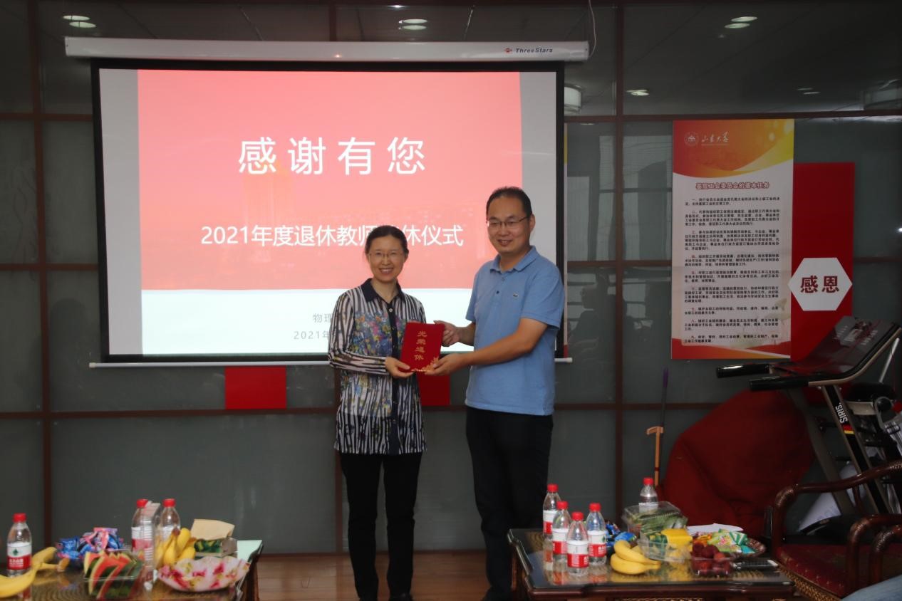 2021年月7月12日下午,物理学院教工之家举行2021年度赵丽生、萧淑琴老师荣休仪式,学院院长陈峰、党委书记郁鹏、副院长郝晓涛和司宗国、工会主席吴厚政和部分师生等出席,陈峰院长为2位荣休教职工颁发了退休证书。本次活动得到了学院工会室的赞助和大力支持。