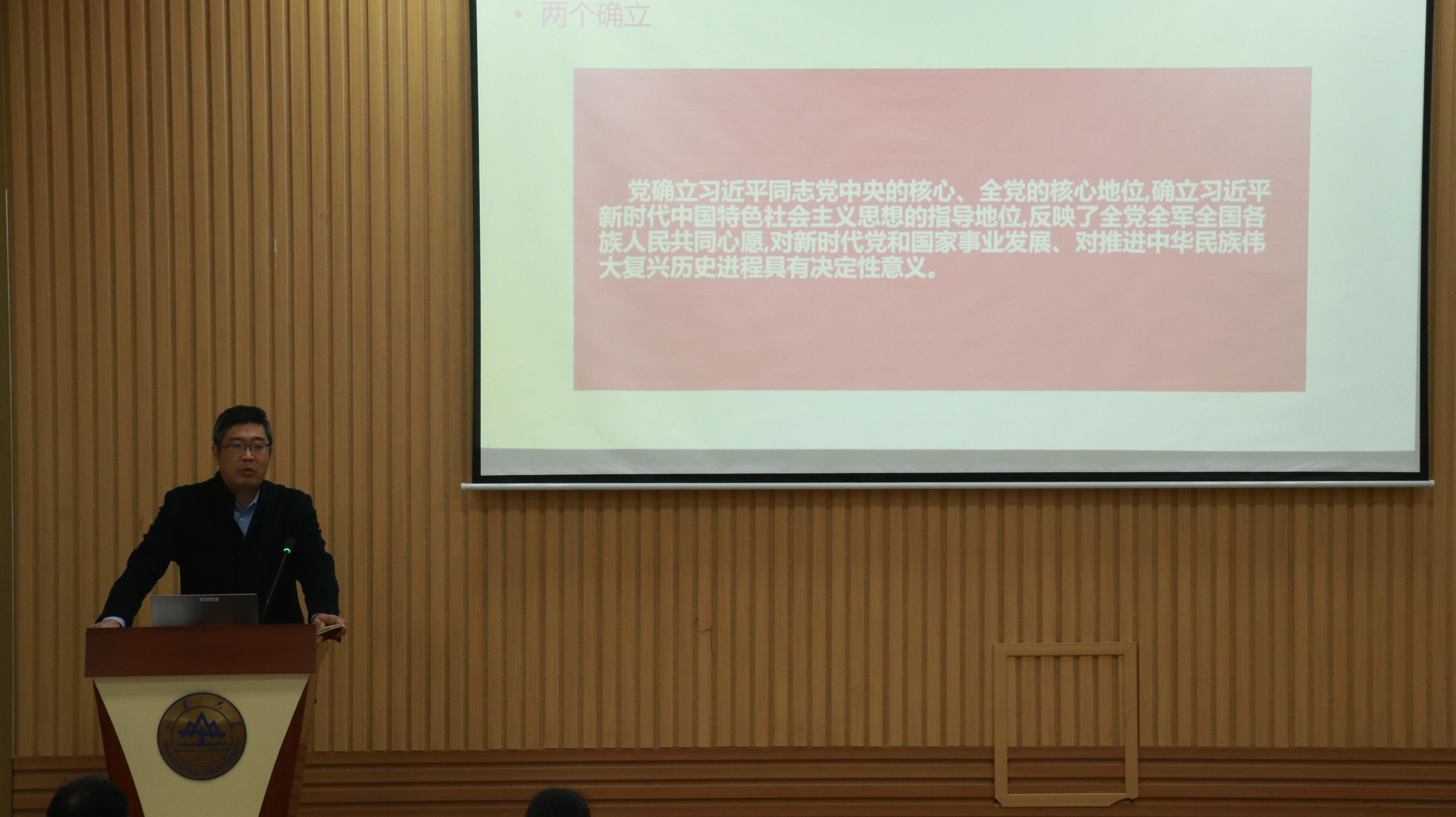 伴随着雄伟的国歌声,团代会正式拉开序幕。郁鹏代表学院党委对大会的召开表示祝贺,并带领与会代表集体学习了党的十九届六中全会精神,他以四个历史时期四个伟大飞跃、马克思主义中国化的三次飞跃、两个确立、五个方面历史意义、十个“坚持”历史经验、牢记一个根本问题、一个号召等七个部分为纲逐一解读了《中国共产党第十九届中央委员会第六次全体会议公报》和《中共中央关于党的百年奋斗重大成就和历史经验的决议》。学习最后,他号召全院学子要心怀“国之大者”,坚持“四个面向”,从党的百年征程中传承弘扬伟大建党精神,从老一代物理人的不懈奋斗汲取科学家精神,努力研究真问题、做真学问,争做时代先锋。随后,曹晓习作《山东大学物理学院团委2021年工作报告》,她以“着力增强‘三性’,服务青年成才”为题向与会代表报告了学院团委2021年聚焦政治性、先进性、群众性全面开展思想引领、素质拓展、服务师生等的各项工作成果。