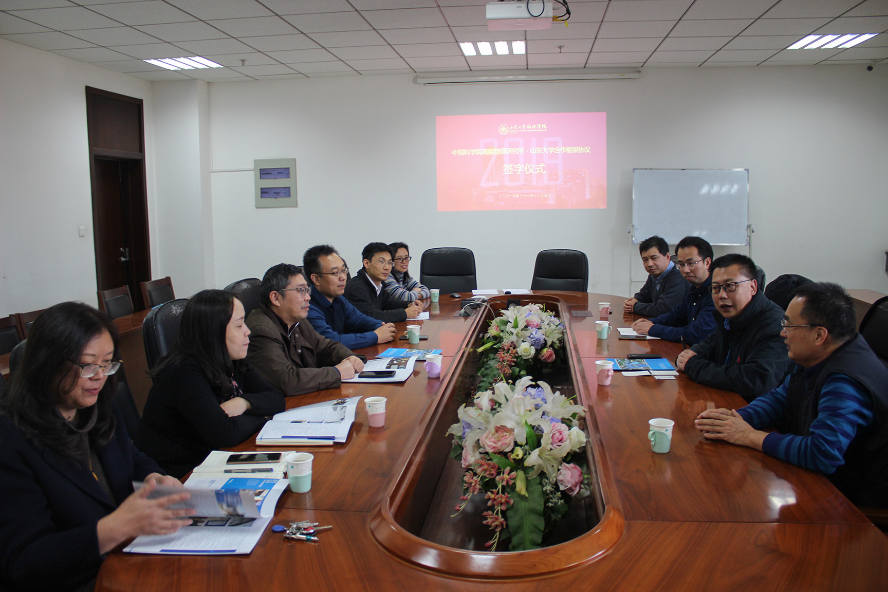 首先,郁鹏书记和魏龙教授分别介绍了山东大学物理学院和中国科学院高能物理研究所的整体架构、教学科研进展、学科专业发展规划等情况。双方认为,这次强强合作,是全面贯彻落实教育部关于世界一流大学和一流学科建设总体方案的迫切需要;是全面落实中国科学院科教结合、协同育人计划方案的迫切需要;是着力推进山东大学物理学科建设,进一步促进物理学院理论物理及相关专业综合发展和科研水平提高的迫切需要。随后,郁鹏和魏龙分别代表山东大学物理学院和中国科学院高能物理研究所交换了协议签字文本。
