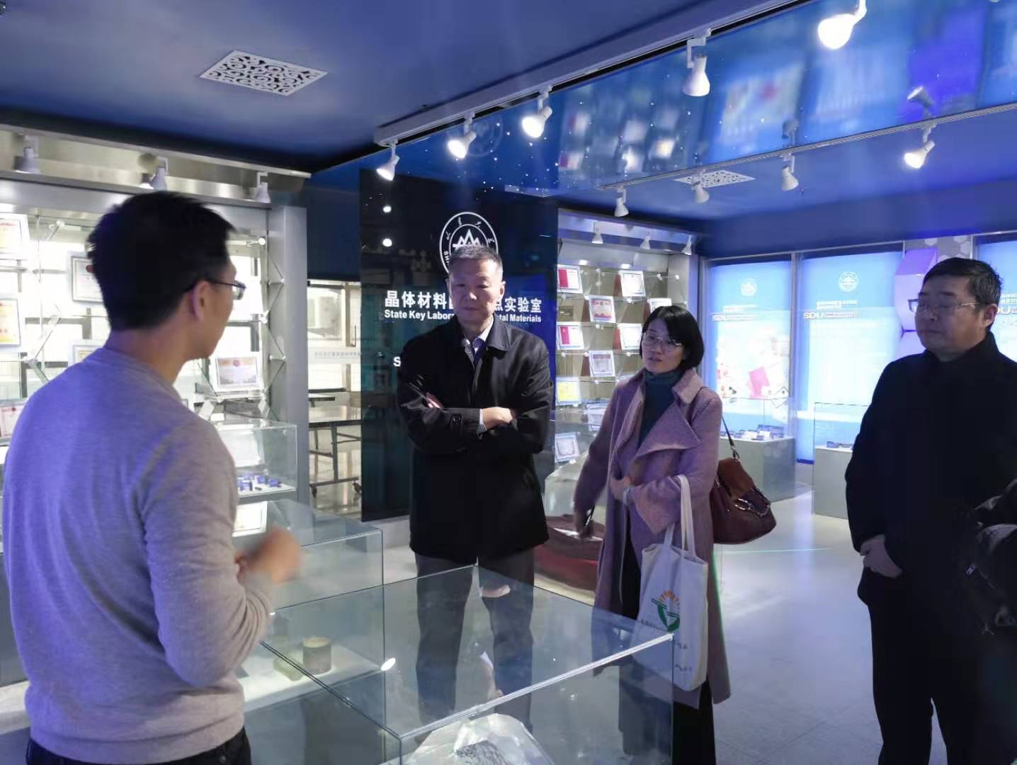 苗波一行首先考察了物理学院凝聚态物理研究所陶瓷实验室,相关老师详细讲解了功能陶瓷的制备、表征等过程,展示并介绍了表征仪器和相关样品的制备,回答了大家提出的问题;随后,来到晶体材料国家重点实验室,参观了晶体材料展室,了解了有关晶体的研究进展、应用背景和为国家带来的重大贡献。最后,参观了学校结构成分与物性测量平台,平台负责人董姝丽、赵明磊介绍了色谱&质谱&热分析、光谱能谱分析、微纳加工与物性测量、核磁波谱、电子显微与结构分析、交叉功能测试六个实验子平台建设进展情况,平台将坚守服务科研的初心,遵从学校双一流建设的战略布局,对接社会科学研究需求,逐步形成“人才培养平台”“科学研究平台”“学科建设平台”“社会服务平台”等鲜明的服务特色和优势,以崭新的面貌为学校的事业发展贡献力量。
