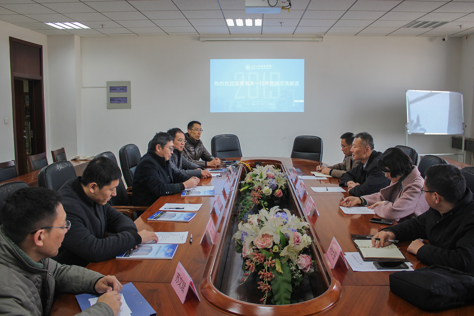 11月29日,淄博海关副关长苗波、综合技术服务中心副主任张丽,高级工程师许宏民、孙计赞一行四人参观访问物理学院。学院党委书记郁鹏、副院长赵明磊、凝聚态物理研究所副所长李吉超、应用物理系副主任苏文斌及副教授刘剑等陪同参观并参加座谈。
