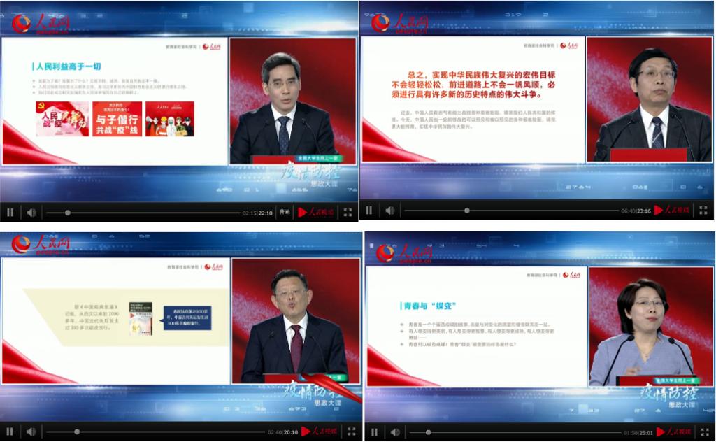 本次“全国大学生同上一堂疫情防控思政大课”主讲人为艾四林、秦宣、王炳林、冯秀军四位教授,他们结合马克思主义基本原理概论、毛泽东思想和中国特色社会主义理论体系概论、中国近现代史纲要、思想道德修养与法律基础等四门必修思政课的教学内容,进一步解读了党中央关于疫情防控的决策部署;总结了我国历史上关于疫情防控的经验教训;分析了中国在此次抗击肺炎疫情中彰显出来的中国共产党的坚强领导核心作用和中国特色社会主义制度的显著优势;讲述了一代又一代中国青年的奋斗故事。透过正在中国发生着的抗击疫情的火热实践,为同学们上了一堂鲜活而难忘的思政课。