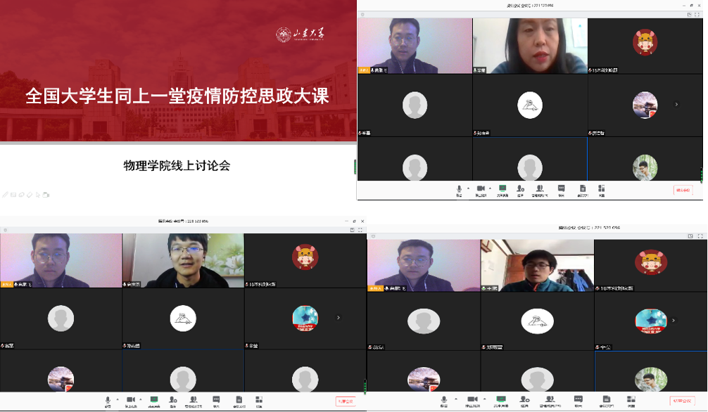 3月11日下午,物理学院组织了防疫思政课线上讨论会,学院党委副书记辛莹、辅导员曹晓习、个鹏飞及本科、研究生部分学生代表参与了此次讨论会。辛莹在讨论中指出,强大的祖国为抗击肺炎疫情提供了强有力的支撑,从政策、经济、人力等各个方面为打赢疫情防控阻击战奠定了坚实的基础;全国快速高效大动员、大集结、大作战,党的坚强领导和中国特色社会主义制度优越性在此次抗击疫情阻击战中得到了充分的彰显;这场疫情防控战争,我们每个人都是“战士”,越是艰险越能深刻体现全国人民团结一心的血肉深情,同学们要坚定必胜信念,担当历史使命,把小我融入大我,把青春梦想扎根祖国广袤大地。讨论会上,来自本科、研究生不同年级的同学们纷纷发表了自己收看“思政大课”直播后的学习感悟。他们认为肺炎疫情暴发让他们更真切地感受到了中国特色社会主义制度的优越性,认识到了党是领导一切的,只有在中国共产党的集中统一领导下才能集中力量办大事。有同学指出,我们必须要理性对待人与自然的关系,既要理解“人类命运共同体”的深厚内涵,又要养成“生命共同体”的生态审美观,践行文明、健康、环保的生活方式。还有同学认为,新时代青年学子重任在肩,当前阶段,做好居家学习、科研、生活,力所能及地参与家乡疫情防控工作,坚持科学理性的防控措施,就是在抗击疫情中体现青年的责任与担当。一线抗疫战士们的感人事迹和不同年代青年的奋斗故事,也深深地激发了物院学子们的家国情怀。