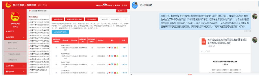 开展“智慧团建”线上团支部、团员摸底排查工作,组织全院各团支部完善支部信息、清查团员数量,夯实组织基础,厘清系统基数。部署动员2020年团支部“达标升级”工作,要求各支部按照学校工作要求开展自我评估,整理相关档案材料。联合各学生党支部,着力做好新学期线上“推优入党”动员工作,号召物院青年团员向防控疫情期间涌现的先进党员学习,用实际行动向党组织靠拢。