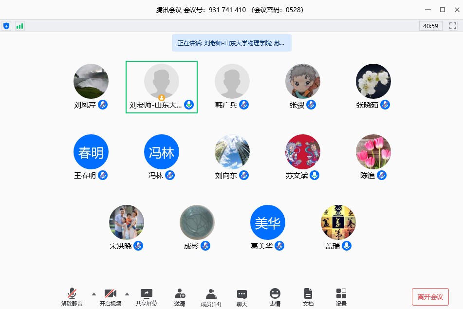 2020年5月28日物理学院通过腾讯会议在线召开了大学物理教学研讨会,大学物理课程团队共有14位教师参加,基础物理教学研究中心主任刘建强教授主持会议。