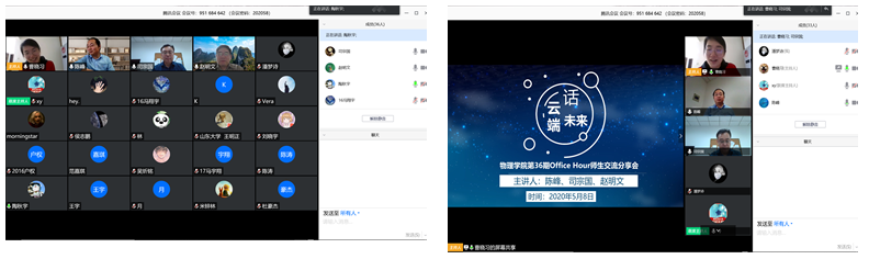 Office Hour师生交流作为物理学院搭建“三全育人”平台的品牌活动,为进一步整合教师资源、发挥教育合力、提升育人质量探索了新的思路。此次“云端话未来”线上师生交流活动,进一步推动实现了“打造有温度的本科教育”,使物院学生在个人成长、选择的关键节点得到专业指导,帮助学生在学业上获得进步,在发展方向上更加明晰,在老师的关怀与引导中成人成才。