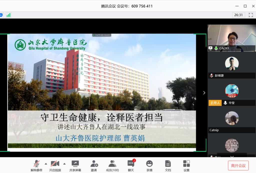 4月17日下午15点许,物理学院“守卫生命健康,诠释医者担当”Office Hour师生交流活动如期而至。此次Office Hour师生交流活动邀请到了山东省第四批医疗队副领队主任曹英娟作为主讲嘉宾,讲述赴鄂援助期间的亲身经历与感受。物理学院院长陈峰作为特邀嘉宾出席此次线上交流会。此次交流会由物理学院党委副书记辛莹主持。
