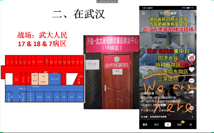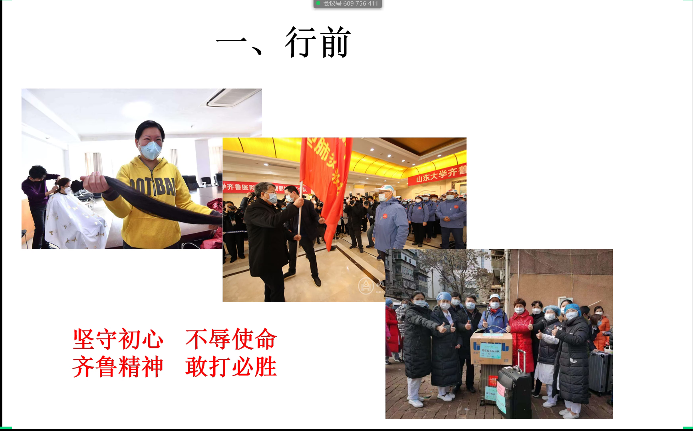 交流中,曹英娟主任结合自身赴鄂援助经历,以“行前”、“在武汉”,以及“归来”这三个时间节点,分享了自己与131名医护人员的抗“疫”路程。行前,剪发、告别、宣誓,每一名医护人员心中除却对未来的担忧,更是坚定的怀揣着“坚守初心,不辱使命,齐鲁精神,敢打必胜”的信念。舍小家为大家,毅然决然奔赴武汉。曹英娟回忆道:“临行前,或许不能算作军令状,但我自己心里已经想好了,这131位队员,不可以出现感染之类的状况。如果有万一,我一定是最后一个离开的。”字字无华,却重若千钧。随后,曹英娟讲述了在疫情一线奋战的点点滴滴。雾化吸入器的改进与医疗器械的细致分离是对患者安全与生命的最高敬畏,《雾霭消逝霁云终临——给武汉病友的一封信》是医者对病友们的贴心关怀,爱心书屋的创办更是如同春雨润物般无声地安抚着每一颗焦虑不安的心......。2月6日至4月6日,两个月的时间,曹英娟及整个赴鄂医疗队用自己的实际行动彰显了深藏于心不言语表的家国情怀。
