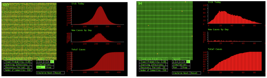传播概率是病毒从患病者传播到相邻健康人的机会。出行概率决定某人决定去其他社区的可能性。恢复期决定了病人不能再传播疾病的天数。社会隔离是我们抵御大流行蔓延的主要防御手段。如果我们可以降低传播率,则可以一次减少总感染人数,也可以减少最大感染人数(换句话说,我们“扁平化”曲线”)。从下图中我们可以看出,在一个65000个家庭的社区中,当出行概率为千分之一时,有160个家庭感染,而在其他参数不变的情况下,仅仅将出行概率增至千分之五,感染人数就暴增至45000个家庭,在如此大规模的感染下,最终只能靠集体免疫才消灭病毒。