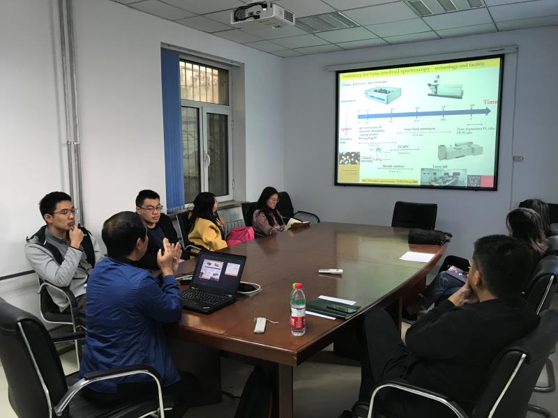 超快时间分辨光谱及显微技术已经广泛应用于光伏、光催化及发光材料及器件的光物理和载流子动力学研究,能够揭示相关材料及器件中载流子运动的物理机制,并为进一步改进材料合成和器件设计提供实验依据。在报告中,文老师全面地介绍了超快时间分辨光谱及显微技术,特别是其在几种新材料(如卤化物钙钛矿(Perovskites)、InGaN/GaN多层量子阱纳米柱 (nanorods)、碳纳米点/石墨烯量子点(Carbon nanodots and graphene QDs)以及金纳米团(Au nanoclusters))中的典型应用,从实验理念、设备搭建和数据处理分析等方面阐释了当前超快光谱显微技术的进展。在座师生认真聆听,并结合自身的科研工作与文老师进行了深入交流和讨论。
