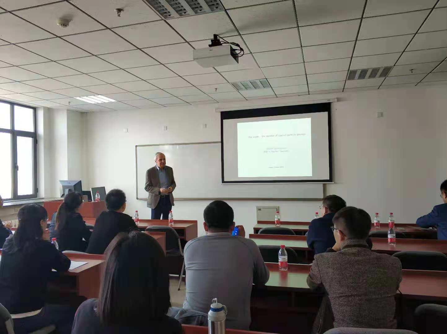 10月24日下午, Bernreuther教授作题为“The Axion—the zombie of (astro) particle physics”的学术报告。报告由司宗国教授主持。报告中,Bernreuther教授系统介绍了提出Axion的历史以及研究现状,并对与Axion相关的暗物质研究进行了详细讨论。报告结束后,Bernreuther教授回答了参加报告的师生提出的问题,并就目前理论物理研究的热点学术问题与大家进行了深入交流。物理学院理论物理专业的教师、研究生以及部分本科生参加了报告。