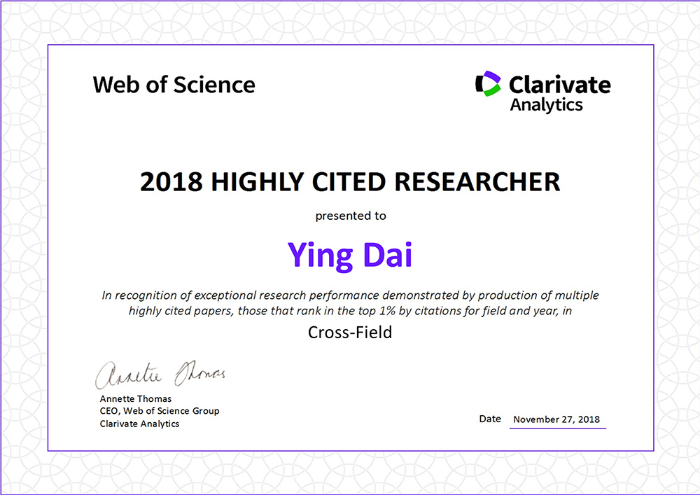 2018年11月27日,科睿唯安(ClarivateAnalytics)正式发布2018年全球“高被引科学家(Highly-Cited Researchers 2018)”榜单,该榜单在全球范围内共甄选出6000多位科研精英。山东大学有三位教授入围,其中我院戴瑛教授榜上有名。
