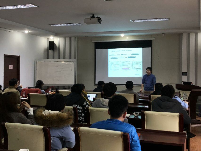 修鹏副教授作了题为“膜曲率重塑蛋白BAR Proteins 诱导细胞膜成管的物理机制”的报告。在这个报告中,修鹏副教授主要介绍了BAR蛋白的运行机制,对于这个问题从三点展开了详细介绍。一是从数学、生物过程两方面解释了细胞膜在BAR蛋白作用下的成管原因,二是推导得出了在BAR蛋白作用下细胞膜的成管条件,三是预测了成管的细胞膜表面BAR蛋白的覆盖率。