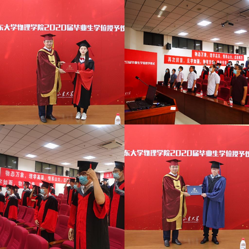 相聚有时,情谊永存。2020年6月28日上午,山东大学物理学院2020届毕业研究生学位授予仪式在知新楼c座七楼量子报告厅举行。作为2020年山东大学研究生毕业典礼的分会场,物理学院全程直播山东大学2020年研究生毕业典礼,带领学生参与拨穗礼,组织学生依次上台接陈峰院长授予学位并合影留念。陈峰院长寄语毕业生“三个希望”:希望同学们将自身看作一把火,拥有炽热的理想和信念;希望同学们将自身化作一汪水,千变万化,不为所拘;希望同学们将自身化作一棵树,身正行直。特殊时期,一场特别的毕业典礼,不变的是温暖与感动。博士毕业生代表马利男这样说到:“五年山大时光使我变得富有,时间带走了青春,却留下了重重的回忆。在最后的毕业时刻,每天行走在校园内心都充满学校和学院带给我的感动。纵有万般不舍,也要说声再见,聚散终有时,后会亦有期。”