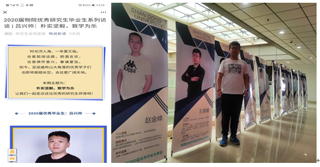 朴实坚毅,治学为乐。为有效发挥朋辈教育的榜样力量,物理学院举办优秀毕业生事迹展,并开展优秀研究生毕业生访谈活动。通过采访优秀毕业生代表,展出优秀毕业生事迹,宣传其求学科研旅程,为上下求索的物理学子树立榜样,引领发展。吕兴帅作为优秀毕业生代表,博士在读期间获山东省优秀毕业生、山东省优秀学术成果奖、山东大学校长奖、学业奖学金、山东大学优秀研究生标兵、国家奖学金、山东大学研究生优秀学术成果奖等。他勉励物理学弟学妹:“成为一名合格的科研工作者,需要具备朴实坚毅的治学态度,亦需要创新的精神。路漫漫其修远兮,愿诸君持之以恒,上下求索。”