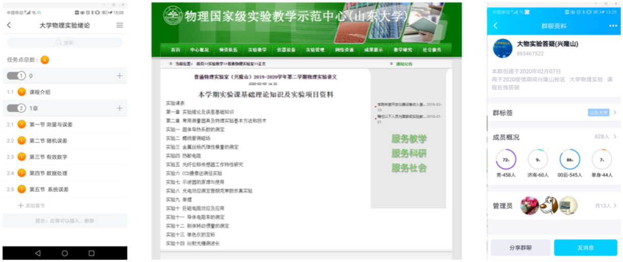 疫情之初,积极应对。由于实验室对实验课的大容量线上教学没有任何准备,因此在开学之初就积极应对,首先通过雨课堂将大学物理实验绪论和误差理论基础知识做了直播讲解,并录制绪论视频、整理实验操作录像、实验讲义电子版(包括仪器更新后的新讲义),分别放在学习通、物理学院实验中心网站及QQ答疑群上,便于学生自学、预习,老师随时在群里答疑,期待学生返校进实验室做实验时能尽快适应、顺利完成实验过程。
