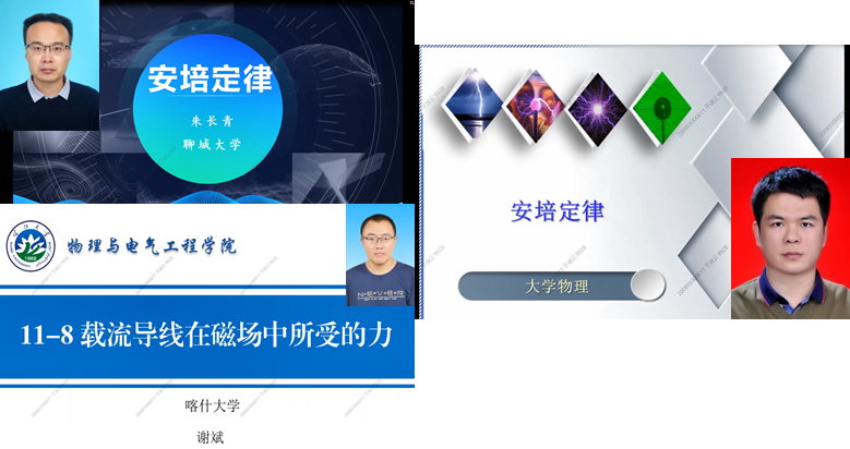 本次活动邀请了聊城大学的朱长青、福建师范大学的黄志平、喀什大学的谢斌三位老师参加讲课活动。三位老师以“安培定律”为题,根据各自不同的教学目标和要求做讲课示范。会议邀请了哈尔滨工业大学物理学院副院长、哈工大素质教育督导组组长、黑龙江省教学名师张宇教授,全国高等学校热学课程教学研究会副理事长、西安交通大学理学院方爱平教授,甘肃省物理学会理事、西北五省物理教学指导委员会委员、兰州大学物理学院王建波教授,齐鲁工业大学青年教学名师、说课能手、教学方法改革标兵胡涛副教授做点评嘉宾。几位嘉宾从教学设计、教学内容、教学流程、课程思政等多方面对三位老师的讲课进行了精彩点评。