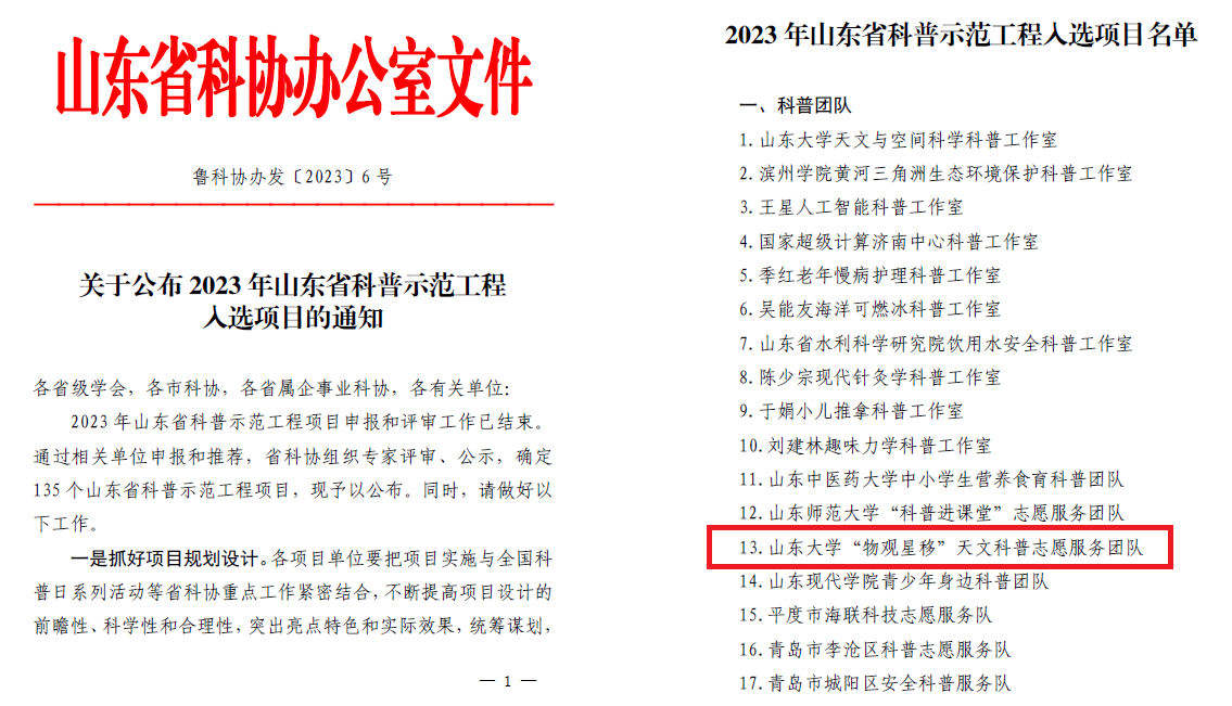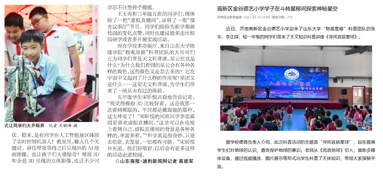 “物观星移”天文科普志愿服务团队是物理学院团委指导下的公益服务团体,由40位工作在科研教学一线的高校教师和本科生共同组成。团队成功打造了基础课程和扩展课程两个模块,包括“星系”“星云”“古代天文学”等在内的14套天文科普课程,分层分级、由简入繁,带领中小学生打开宇宙之门、探索浩瀚星辰。自2018年9月成立至今,团队累计开展科普活动67次,受益中小学生4283人次,覆盖济南市历城区洪家楼小学、山东大学附属中学、济南市第三中学、淄博市虎山小学等17所中小学,以科普讲座、模型互动等方式将天文知识生动地展现在中小学生面前。团队相关活动报道在济南日报报业集团、山东商报、FM93.6济南广播等平台均有推出。今年6月,团队成功入选山东省科协组织评审的“山东省科普示范工程”,全省入选团队共计65支。