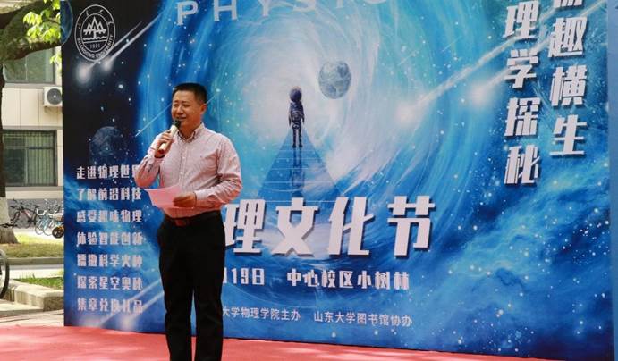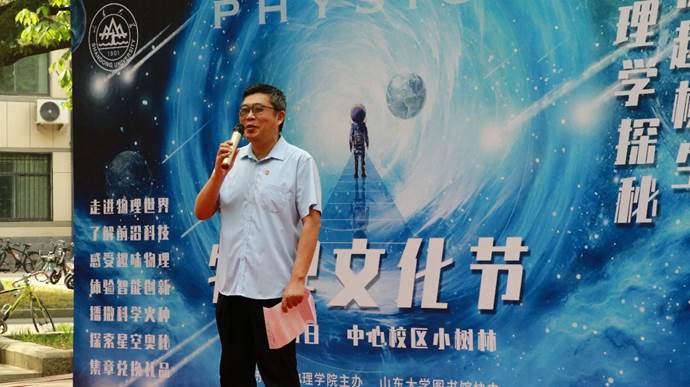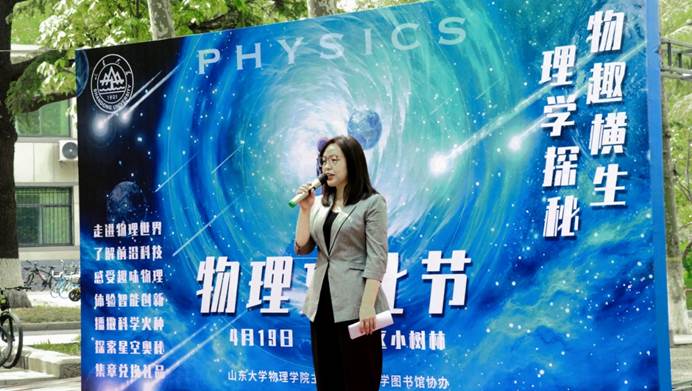 为贯彻落实学校“学在山大,快乐成长”教育理念,激发广大学子对物理学科的兴趣,4月19日,物理学院“物趣横生·理学探秘” 首届物理文化节在中心小区小树林成功举办。研究生院副院长、党委研究生工作部副部长高弟,图书馆副馆长程川生,团委副书记郑柔澄,物理学院党委书记郁鹏,物理学院副院长秦伟出席活动启动仪式。本次活动由物理学院党委副书记辛莹主持。在文化节举办的office hour中,物理学院副院长柏利慧向同学们进行读书经验分享。