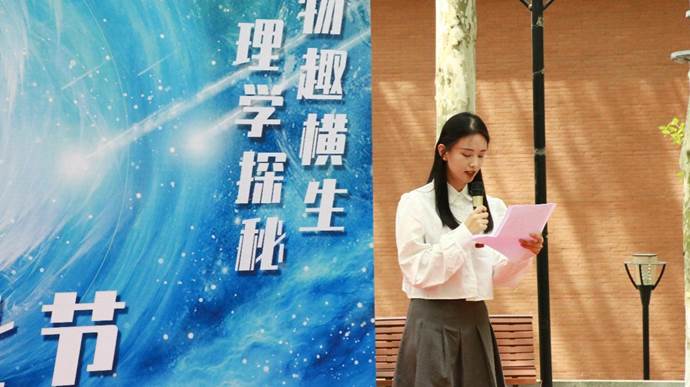 物理学院国家奖学金获得者、2022级本科生吴静雯作为学生代表,分享了自己的学习体会,表达了对物理学科的热爱和对物理文化节成功举办的期盼。