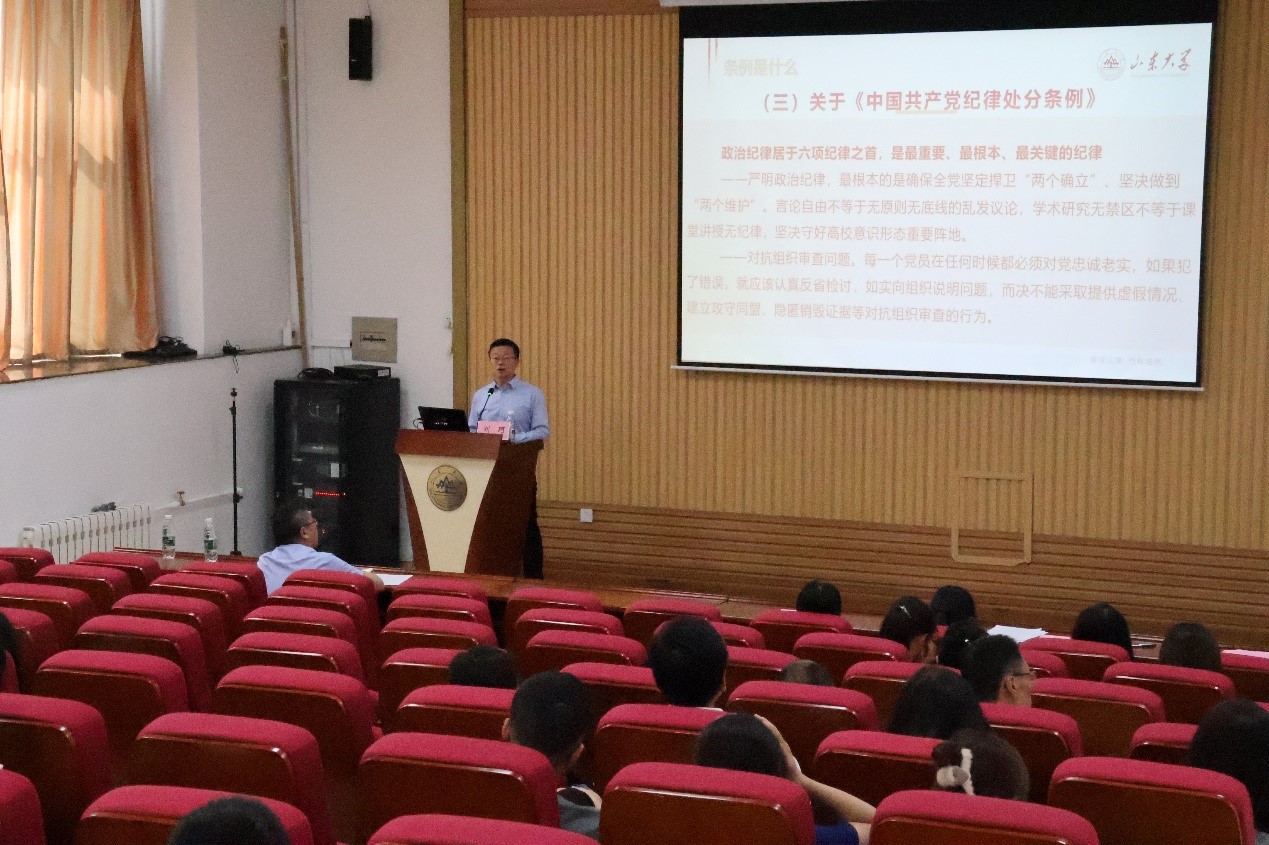 刘珂书记围绕“关于《中国共产党纪律处分条例》的学习体会”主题,对《条例》的主旨要义作深入阐述,对《条例》新修订的五大鲜明特点进行重点解读,并结合学校纪检监察工作对抓好学习贯彻工作进行细致分析,报告逻辑完整、脉络清晰、内容丰富、论述精辟,既有政治高度、理论深度,又有思想厚度、实践格度,紧扣当前学校党风廉政建设面临的新形势、新任务,为与会党员上了一堂生动深刻的专题培训和警示教育课,对深学细悟精准把握《条例》、扎实开展党纪学习教育、推进学院全面从严治党具有启示作用和教育意义。