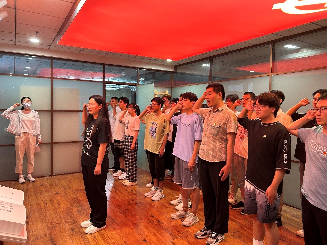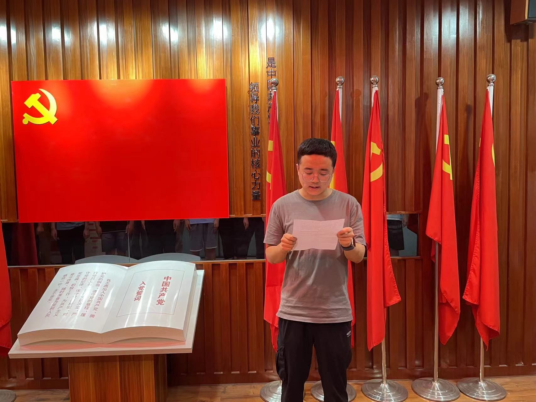 仪式在激昂的《国际歌》歌声中拉开序幕,随后,由硕士研究生一年级党支部书记韩瑞瑞领誓,各位党员佩戴党徽,面向党旗,高举右拳,庄严宣誓,“我志愿加入中国共产党……”铮铮誓言、字字铿锵,许下对党和人民的庄严承诺。
