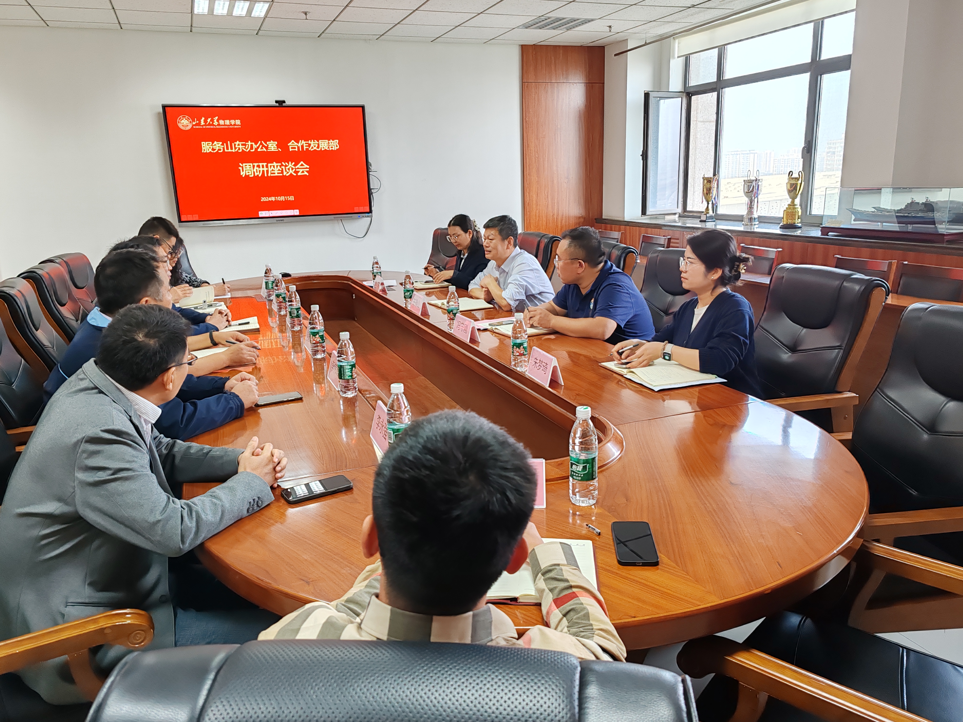 2024年10月15日,服务山东办公室主任、合作发展部部长王禄山一行到物理学院进行调研座谈,会议由物理学院党委书记郁鹏主持,物理学院院长司宗国、副院长柏利慧及其他相关老师参加此次会议。