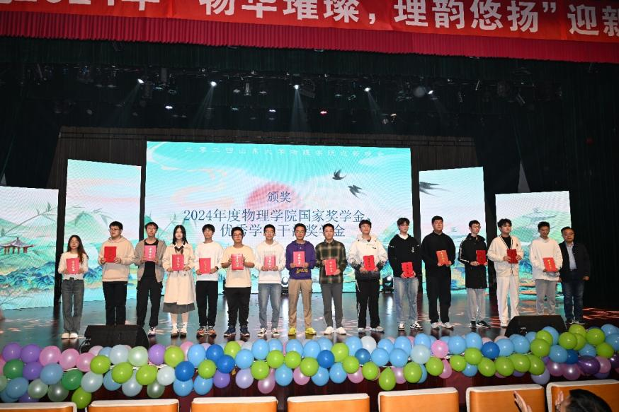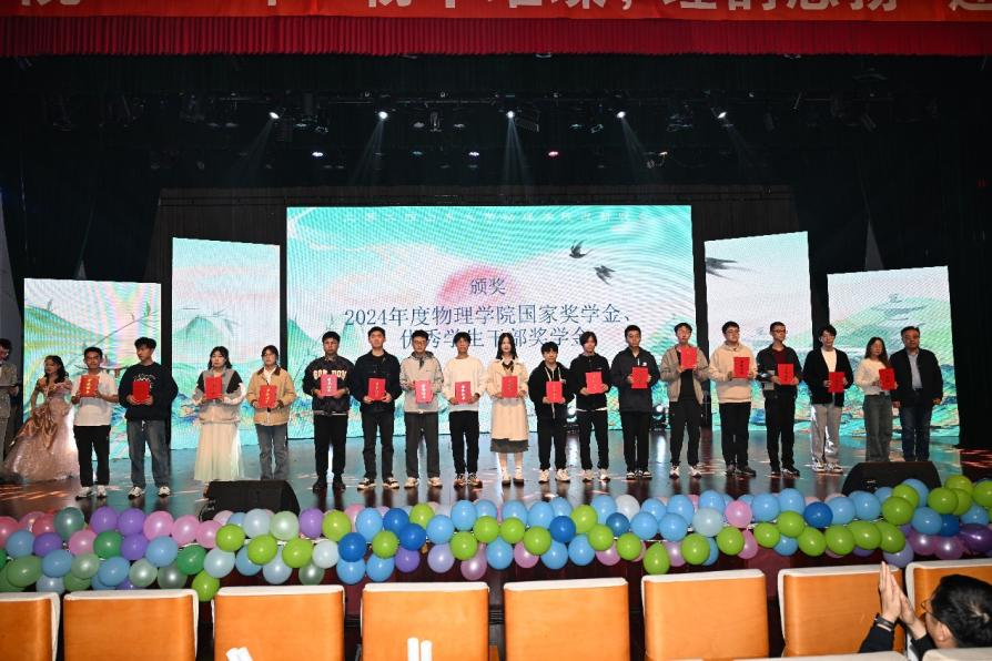 在精彩纷呈的节目进程中,晚会还进行了新聘班主任聘任仪式和优秀学生颁奖仪式,激励学院教师发挥育人合力,鼓舞学院学生学习优秀榜样。在2024级本科学生班主任聘任仪式上,徐孝刚为陈暄、路鹏程、徐金朋、王耀光、饶金威、于淑云六位新生班主任颁发聘书;许福运宣读了物理学院2024年度“心光校友助学金”获助学生名单,并为获助学生代表颁发证书;司宗国为物理学院2024年度国家奖学金、优秀学生干部奖学金获奖学生代表进行了颁奖。同时,晚会还进行了一轮轮激动人心的抽奖环节,将现场气氛推向高潮。晚会最后,物理学院学生会骨干为在场师生献上了趣味舞蹈《恣意好时光》,伴随着动听的音乐和青春的舞姿,晚会在欢声笑语中落下帷幕。