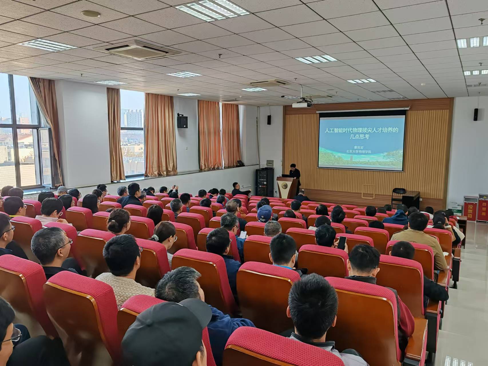 2024年11月21日,物理学院在知新楼C座量子报告厅召开教职工大会,学院院长司宗国主持会议。会议荣幸邀请北京大学物理学院副院长曹庆宏教授以“AI时代拔尖人才培养的几点思考”为主题为大家进行一次别开生面的讲座。