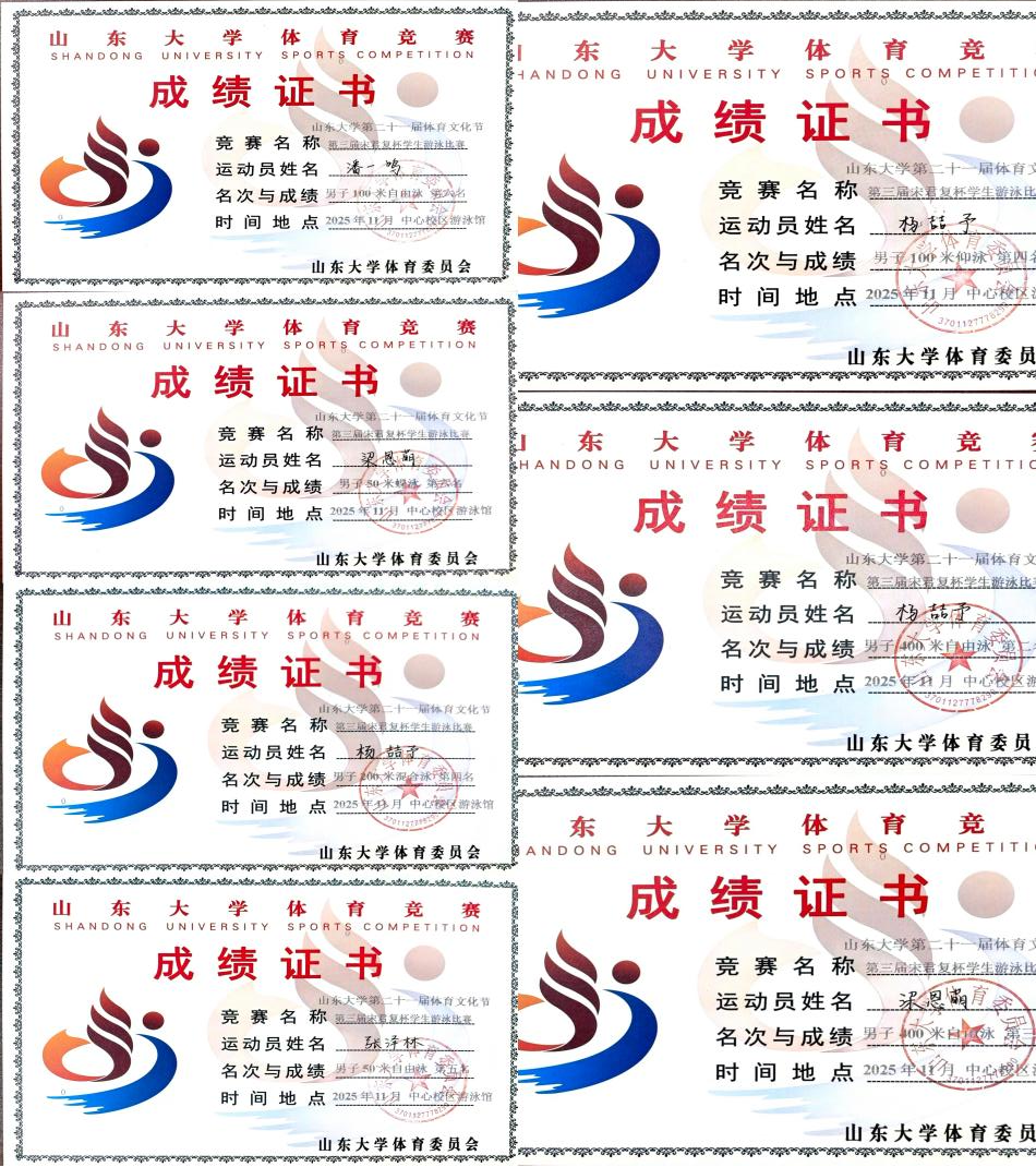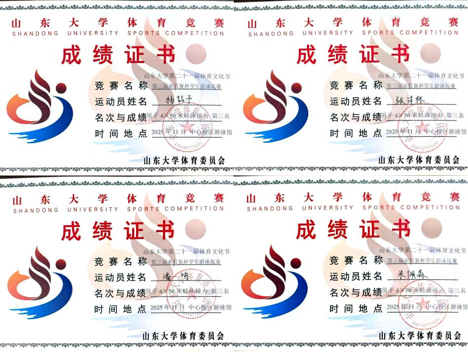 在男子4×50米蛙泳接力项目中,杨喆予、张泽林、米佩森、潘一鸣四位队员凭借非凡的默契与稳定的发挥,以和前两名极小的差距夺得全场第三名。个人项目中,杨喆予同学夺得男子400米自由泳第二名、男子100米仰泳第四名、男子200米混合泳第四名的成绩;张泽林同学夺得男子50米自由泳第五名的成绩;梁恩萌同学夺得男子400米自由泳第三名、男子50米蝶泳第六名的成绩;潘一鸣同学夺得男子100米自由泳第六名的成绩。