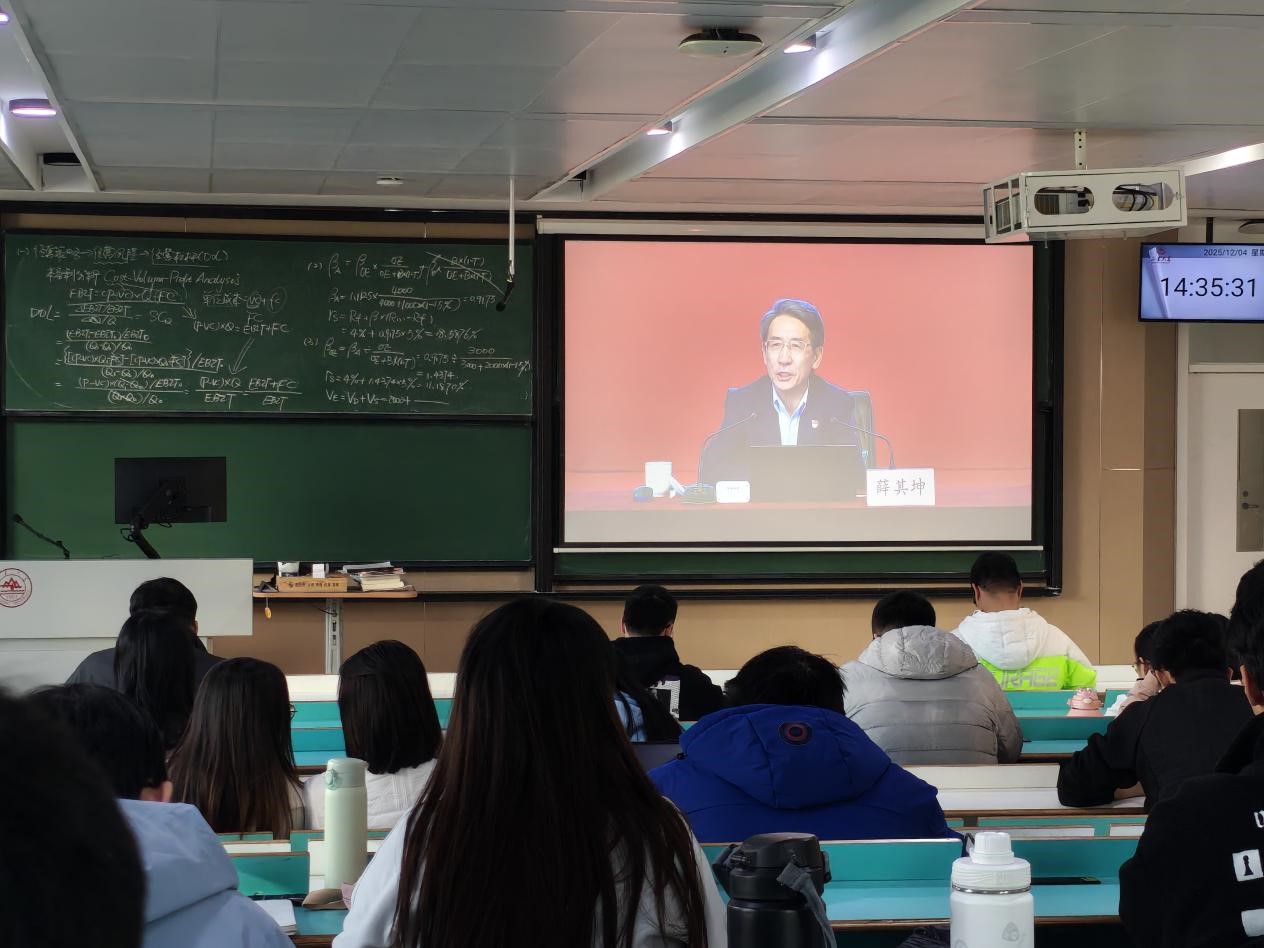为深入学习贯彻党的二十届四中全会精神,统一全院师生党员思想和行动,根据学校统一部署安排,12月4日下午,物理学院织师生党员集中观看由南方科技大学校长、中国科学院院士薛其坤所作的辅导报告。学院于知新楼C709和理综楼315室设置两个分会场,学院领导班子全体成员、各师生党支部书记、师生党员代表200余人参加学习。