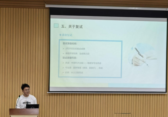 活动中,王彬老师面向备考学生发表动员讲话。他结合近年来考研形势及物理学院学生特点,从专业角度提出科学备考建议,鼓励同学们以平稳心态、合理方法投入复习。他强调,备考过程中既要保持努力与专注,也要注重劳逸结合,以最佳状态迎接挑战。他温暖有力的话语为在场同学注入了信心与动力。