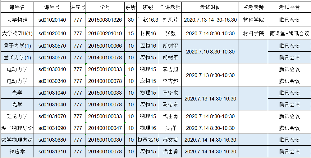 各位同学,2019-2020.3学期 物理学院777课程考试安排如下: